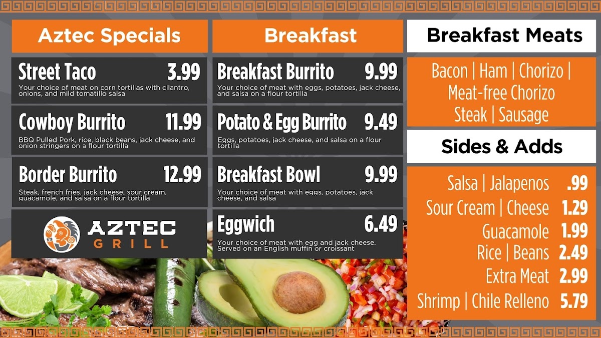 Aztec Grill offers a diverse and flavorful menu that combines traditional Mexican dishes with fresh, high-quality ingredients. For breakfast, the Breakfast Burrito and Green Chile Burrito stand out as hearty options to start the day. The signature burritos are a must-try, especially the Aztec Super Burrito, Aztec Burrito, and Border Burrito, each packed with savory fillings and bold flavors. For those seeking something lighter or more unique, the Street Taco, Torta Sandwich, and crispy Taquitos are excellent specialty items, showcasing authentic street food influences. To complement the meal, guests can enjoy refreshing beverages like the 33 Oz. Bottled Water or a 20 Oz. Soda, ensuring a satisfying experience at this Lakeport eatery.